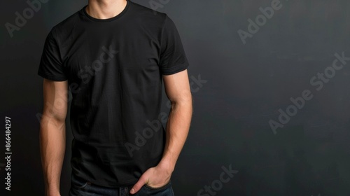 black, t-shirt, shirt, blank, man, male, model, person, fashion, clothing, apparel, design, casual attire, wear, style, grey, background, studio, hand, pocket, standing, arm, sleeve, photoshoot, graphic, template, branding, product, advertising, designer, t-shirt, menswear, man, tee, cotton, jersey, classic, simple, minimal, clean, front view, isolated, ready