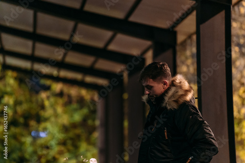 A man in a black winter jacket with a fur hood stands pensively under a modern canopy in a park at night. Warm clothing, soft lighting, and autumn colors evoke a thoughtful, cozy mood