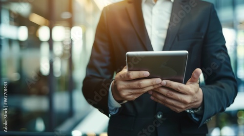 A man in a business suit uses a digital tablet in a sleek modern office, signifying professionalism, technology, and productivity.