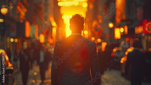 man, sunset, city, street, suit, urban, sunlight, shadow, contrast, traffic, warm, vibrant, light, background, walk, people, dynamic, atmosphere, business, scene, bustling, silhouette, evening, fashion, office, metropolis, journey, professional, travel