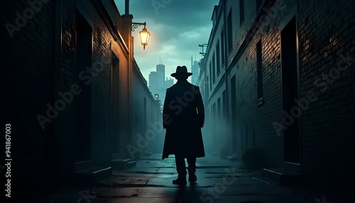 A man in a dark trench coat and wide-brimmed hat walking through narrow, dimly lit streets at night. The cobblestone path reflects the soft glow of streetlights, casting long shadows in the quiet.