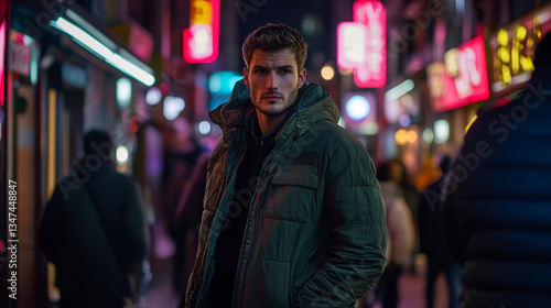 man, jacket, city, street, night, light, urban, portrait, fashion, style, male, model, photogenic, person, clothing, outerwear, downtown, modern, neon, dark, travel, tour tourism, adventure, cool, trendy, stylish, puffer, background, serious, looking, adult