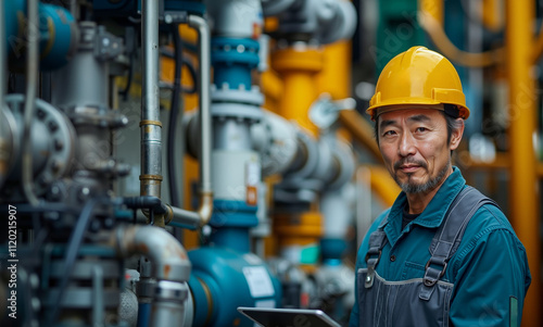man, hard, hat, holding, tablet, computer, front, pipe, industrial, men at work, construction, machinery, equipment, safety, technology, plant, maintenance, setting, wearing, yellow, overall, standing, large, machine, multiple, hand, inspecting, blue, uniform, serious, expression, face, background, blurred, factory, visible, mood, focused