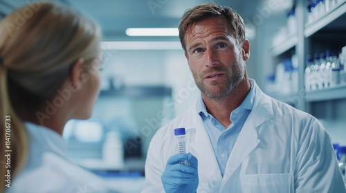 man, laboratory, coat, holding, test, tube, woman, standing, next, wearing, laboratory, research, science, chemistry, medicine, technology, equipment, scientist, medicals, scientific, experiment, person, biology, chemical, doctor, analysing, microscope, biotechnology, professional, microbiology, pharmacy, discovery, clinic, female, team, male, working, chemist, young, white, health, sample, bio, biochemistry, health care, study, student, blue, beaker