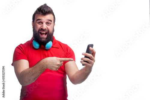a man in a red T-shirt with a beard and headphones holds a phone in his hands