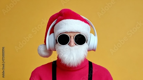 A man in a Santa hat and sunglasses is wearing headphones. The image has a festive and playful mood, as the man is dressed in a Santa outfit and is wearing headphones