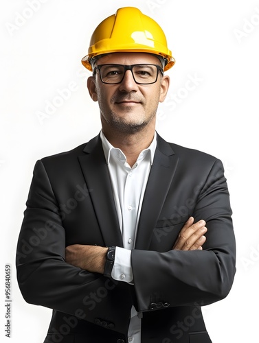 man, suit, hard, hat, yellow, helmet, safety, construction, men at work, arm, folded, professional, confident, serious, businessman, white, background, studio, portrait, head shot, goggles, face, eye, beard, stubble field, wristwatch, cufflink, black, shirt, collar, buttons, fabric, texture, pose, standing, indoor, clean, sharp, sharpened, isolated