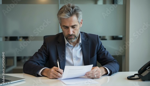 man, suit, document, desk, office, reviewing, pen, paperwork, business attire, concentration, professional, workplace, indoor, adult