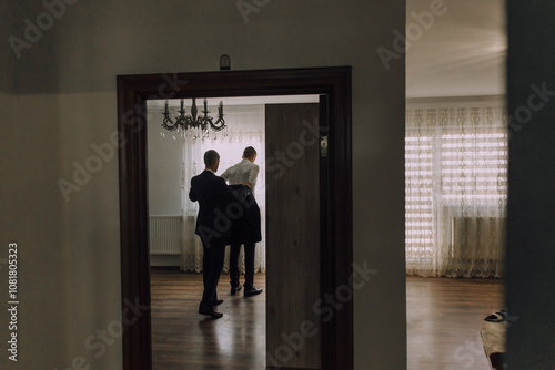 man, suit, standing, front, door, person, female, woman, indoor, adult, beauty, dress, male, couple, interior, building, house, young, corridor, caucasian, wedding, black, background, bride, groom, happiness, home, romantic, wall, white, light, love, happy, portrait, design, doorway, business, entrance, romance, silhouette, together, lady, floor, shadow, holding, lifestyle, room, fashion, bouquet