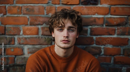 man, sweater, brick, wall, contrast, warm, cosy, stylish, fashion, modern, chic, trendy, earthy, rustic, urban, aesthetic, contemporary, rugged, textured