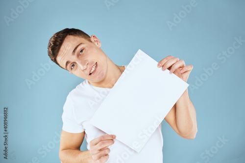 A man in a white t-shirt holds in his hands a sheet of paper emotions cropped view of a blue background Copy Space