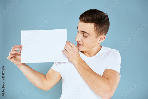 A man in a white t-shirt holds in his hands a sheet of paper emotions cropped view of a blue background Copy Space