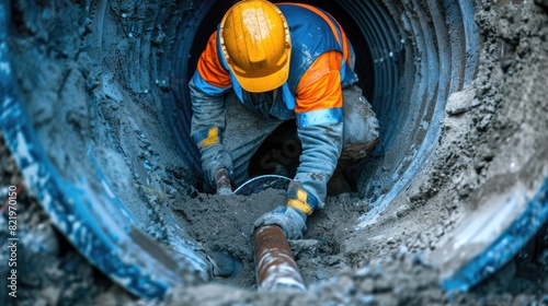 A man in an orange and blue shirt is working on a pipe. Ideal for construction and plumbing industry