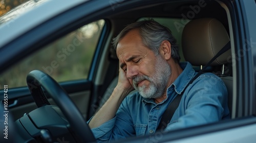 "A man in his 50s looking tired while driving, with closed eyes, an uneasy expression, and a hand on his head from fatigue.