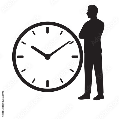 A man in silhouette standing beside a large clock face, symbolizing time management and punctuality, in a simple and modern design.