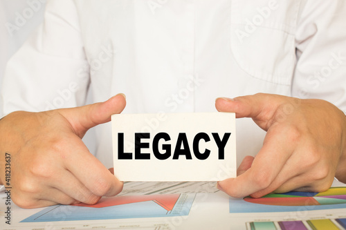 a man in the office holds a card with text LEGACY. business concept