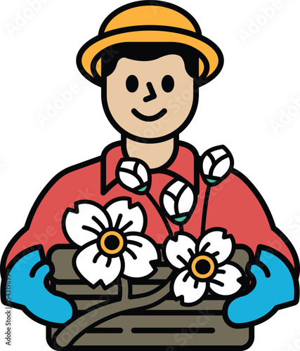 man, holding, basket, flower, smiling, wearing, hat, white, yellow, well, happiness, warmth, vector, concept, cartoon, illustration, happy, art, character, person, children, hand, nature, design, mascot, face, signs, style, young, background, cute, childhood, handyman, boy, handy, plant, symbol, drawing, occupation, gardening, working man, men at work, cheerful, floral, work, male
