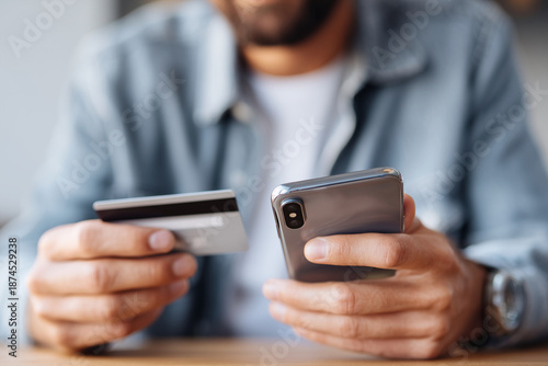 A man is holding a credit card and a cell phone