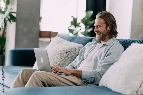 A man is laughing looking on a screen, watching fun videos, relaxing at home.