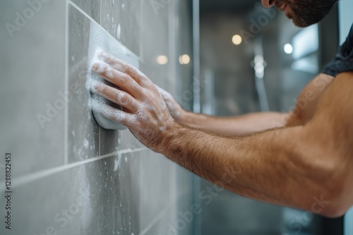 A man is scrubbing the shower wall with soap and a sponge, highlighting the essence of cleanliness and maintenance for a comfortable living space.