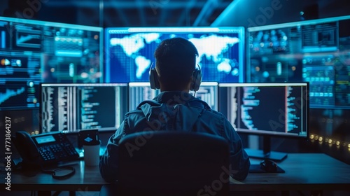 A man is sitting in front of a computer monitor with three screens. He is wearing headphones and he is focused on his work. The room is dimly lit, and the screens are displaying various data