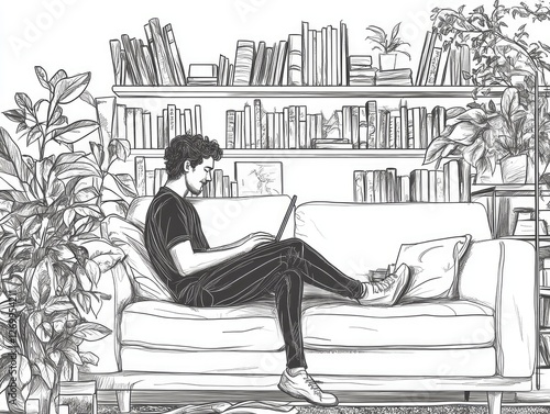 man, sitting, couch, laptop, front, large, number, book, leisure, potted, plant, relaxation, concept, computer, background, technology, illustration, vector, person, cyberspace, working, business, office, lifestyle, sofa, online, character, job, adult, modern, home, freelance, communication, cartoon, men at work, interior, young, house, flat, male, desk, workplace, quarantine, room, design, using, businessman, chair, education