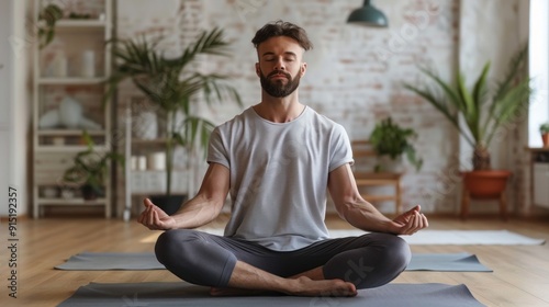 yoga, meditating, relaxation, man, male, person, healthy, young, pose, adult, position, lifestyle, balance, asana, lotus, exercising, zen, spirituality, indoor, body, sitting, mat, sport, concentration, home, mindfulness, activity, practice, wellness, health, fitness, happy, fit, peaceful, guy, mind, calmness, mudra, caucasian, room, hispanic, harmony, training, concept, sporty, cross-legged, beard, posture