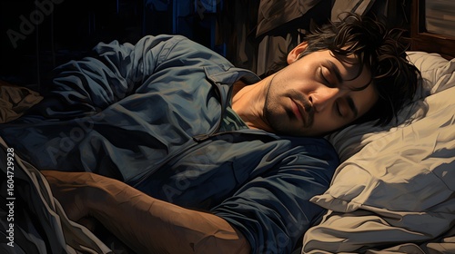 sleeping, man, bed, sleep, rest, bedchamber, portrait, nap, peaceful, dreaming, relaxation, night, calm, face, young adult, indoor, closeup, head, male, pillow, blanket, serene, comfortable, asleep, lying down, dark, alone, calmness, skin, hair, night time, home, eyes closed, drawing, artwork, digital artwork, illustration, interior, studio shot, art, one person, closeup, domestic life, soft, quiet, horizontal, casual attire, looking down, well-being