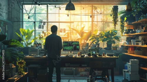 A man is standing in front of a computer desk with a large monitor. The room is filled with plants and has a cluttered appearance. The man is focused on his work
