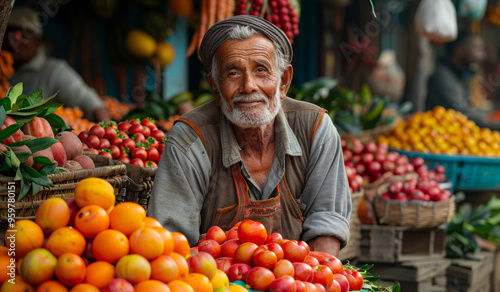 A man is standing in front of a fruit stand with a big pile of oranges and tomatoes. He is smiling and he is enjoying his work