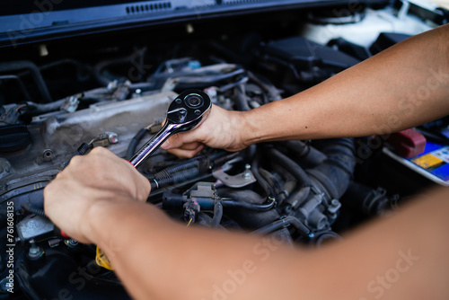 A man is working on a car engine with a socket wrench. Concept of determination and focus as the man carefully works on the engine