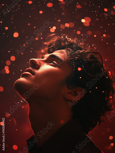 A man looks up at the starry sky, lonely and ethereal