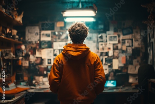man, small, cluttered, apartment, wall, covered, photograph, string, note, he, himself