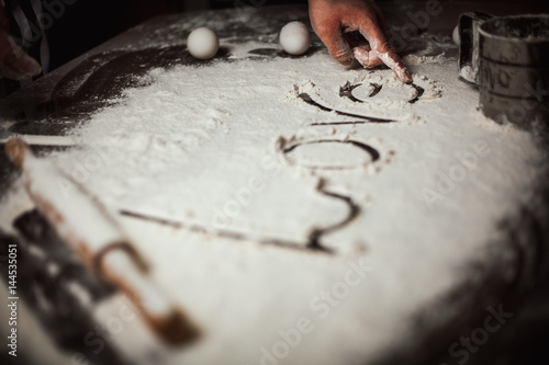 A man prepares from flour and writes a finger with the word love on the table