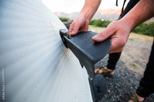 A man puts the fin in his stand up paddle board during an early morning summer SUP session in southeast Washington.
