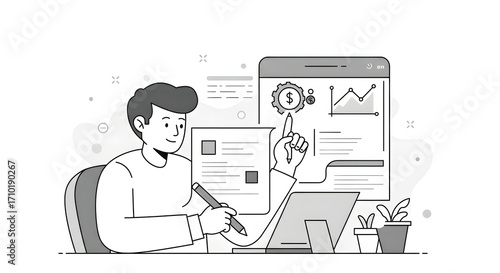 A man sitting at a desk with a phone and a laptop for business presentation, website design, technology blog, or digital marketing