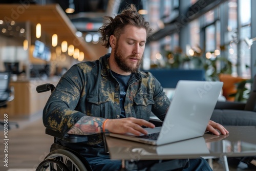 wheelchair, working, laptop, man, cafes, modern, workspace, productive, focused, disabled, inclusive, tech, connectivity, hot drink, shop, industrious, determined, achievement, effort, city, indoor, tattoo, beard, cyberspace, urban, entrepreneur, office, inside, creative, lifestyle, business, studious, dynamic, commitment, content