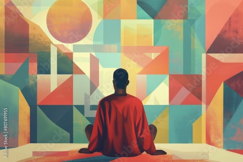 A man sitting in front of a vibrant, colorful wall. Ideal for diverse and creative concepts