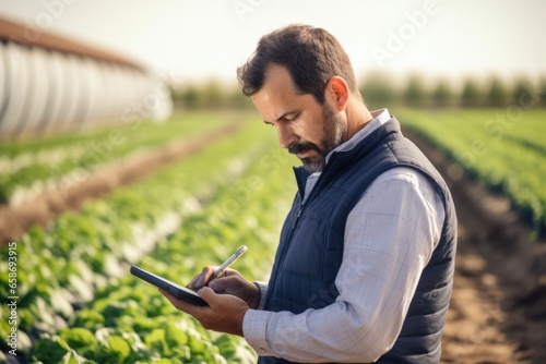 A man standing in a field with a tablet. This image can be used to represent technology in nature or for concepts related to outdoor work or leisure activities.