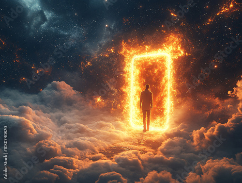 a man standing in front of a heaven golden gat, swirling portal, set against a backdrop of a starry sky.