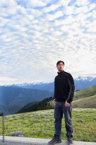 nature, mountain, sky, landscape, people, field, person, grass, outdoors, travel, blue, view, looking, hiking, green, 1, standing, man, happy, summer, mountain, cloud, hill, northwest, washington, national park, olympic
