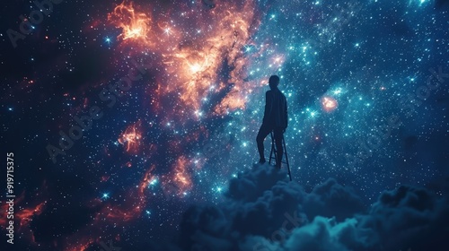 star, silhouette, sky, space, galaxy, nebula, cosmic, astronomy, night, cloud, dream, inspiration, hope, man, ladder, fantasy, art, digital, surreal, imagination, mystery, abstract, wonder, dust, universe, starry, celestial, astral, astrophotography, dark, bright, looking, up, upward, landscape, infinite, exploration, discovery