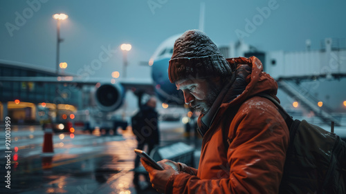 a man typing on a smartphone in front of the plane boarding gate at the airport.