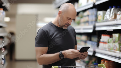client, list, man, market, phone, shopping, smartphone, store, supermarket, adult, male, mobile, people, buy, consumerism, holding, technology, cart, choice, choose, computer, examining, grocery, healthy eating, human hand, indoor, cyberspace, merchandise, pushing, select, shelf, text messaging, streetcar, wireless technology, grocery, buying, mid-age, middle-aged, caucasian, american, ethnic, ai