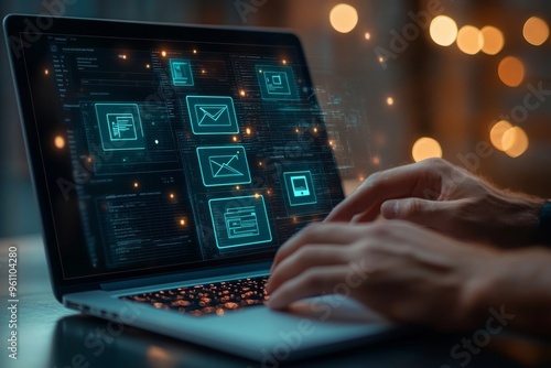 A man using a laptop with a digital document management system interface and documents icon on a transparent screen, representing the concept of business process integration.