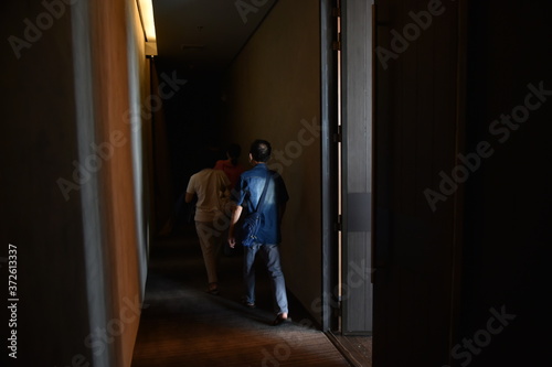 people, woman, window, couple, door, shadow, young, dark, person, house, indoor, corridor, office, silhouette, light, construction, theatre, walk