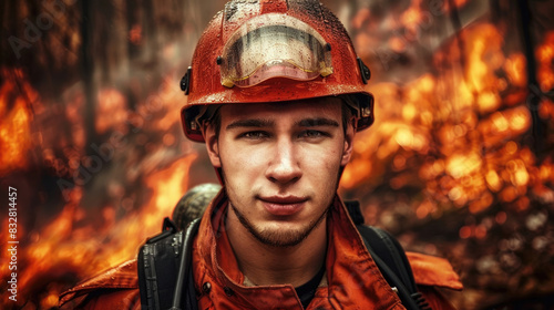 A man wearing a firemans helmet stands in front of a blazing fire, ready to respond to the emergency