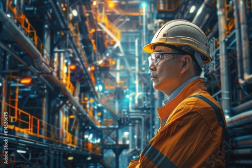 A man wearing a hard hat in a factory. Suitable for industrial and safety concepts