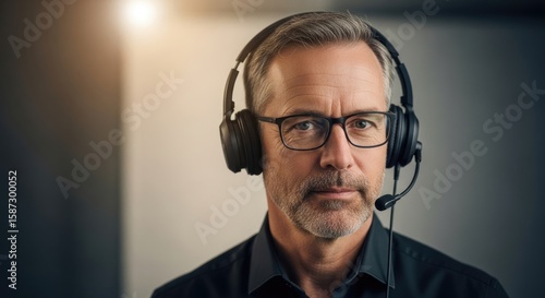 A man wearing a headset and glasses, with a serious expression, looking directly at the camera.