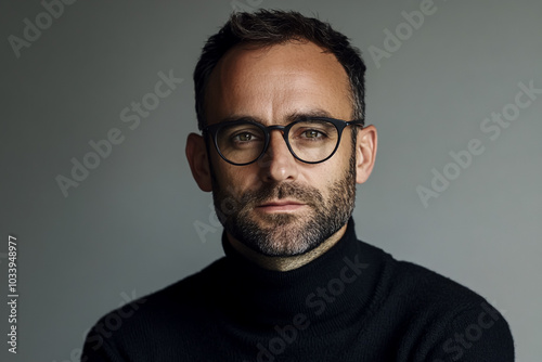 A man wearing glasses, a black turtleneck sweater, and having short hair and a beard.